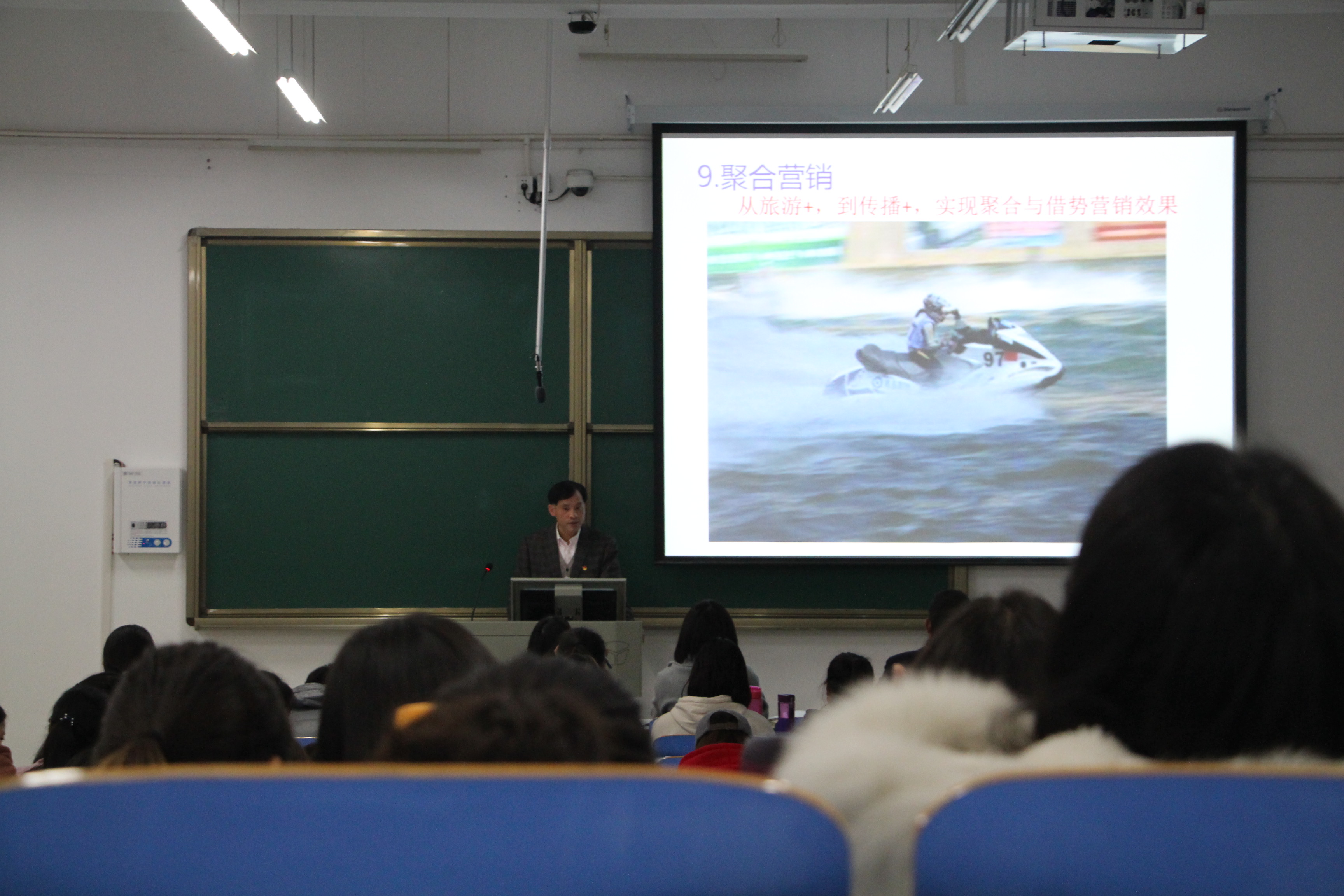报告中,彭荣胜以“旅游营销的发展趋势与现代互联网社交平台的应用”为主题,围绕我国旅游营销方式发展历程这一主线,从“传统营销的“五个一”工程、当下人们的旅游消费特点、旅游营销的发展态势、当前流行的互联网社交平台及特点、互联网社交平台的旅游营销”五个方面进行了深入浅出的讲解,重点讲述了影视作品、高科技和互联网在旅游营销的重要作用,并提出了当前旅游消费“碎片化、娱乐化、体验化、个性化”四大特点。彭荣胜语言幽默诙谐,观点新颖,逻辑清晰,在报告过程中开拓了学子们的思维与眼界,提高学子们的旅游专业素养,提供了一场精彩绝伦的学术盛宴。最后,彭荣胜一一解答了在场学子的提问并结束了此次学术报告。
